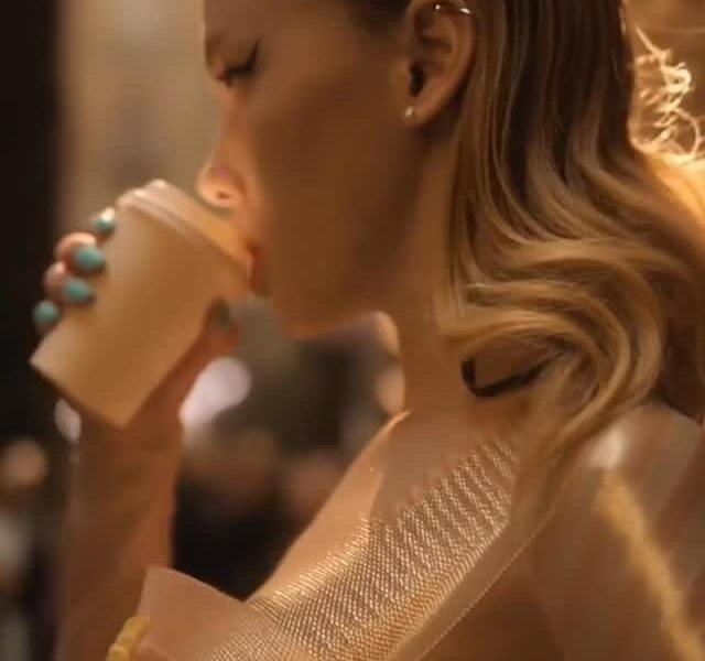 ミニドレスの Miss J2 は、喧騒の中で静かに紙コップのコーヒーを口にする。